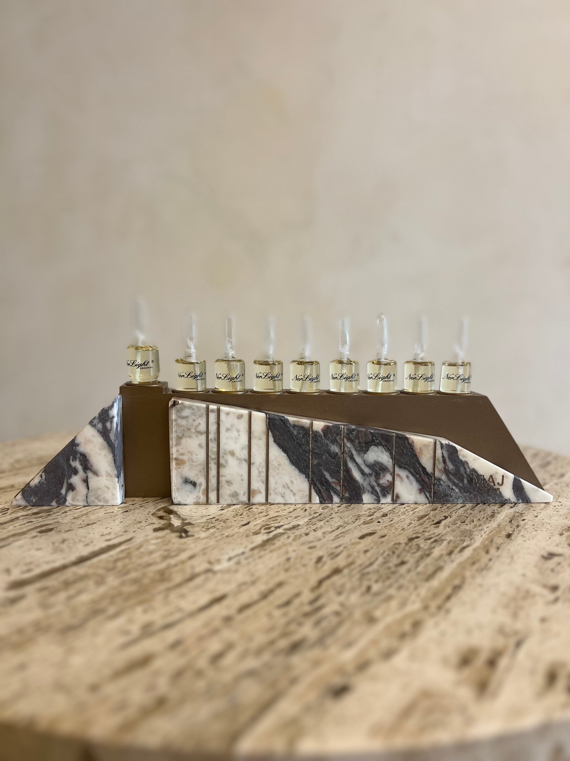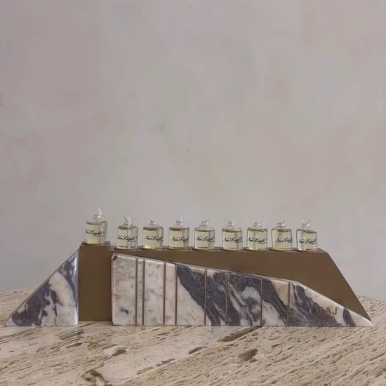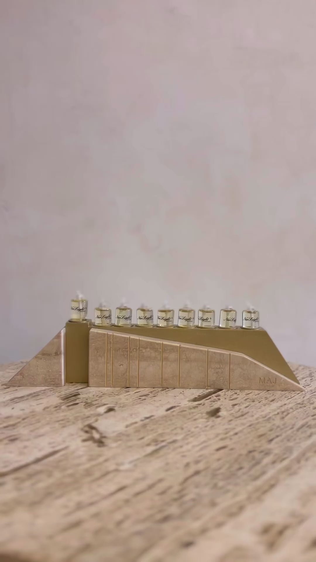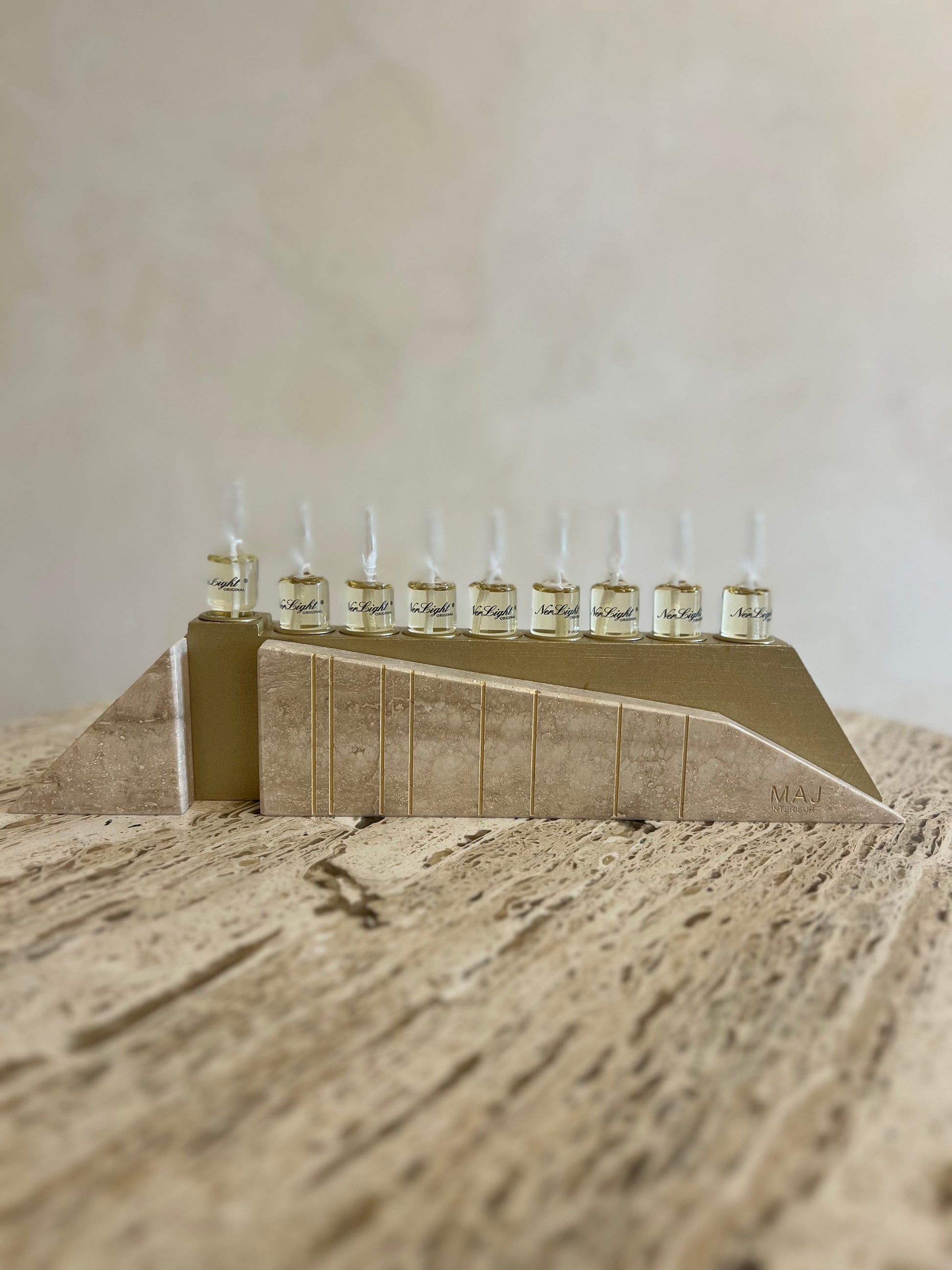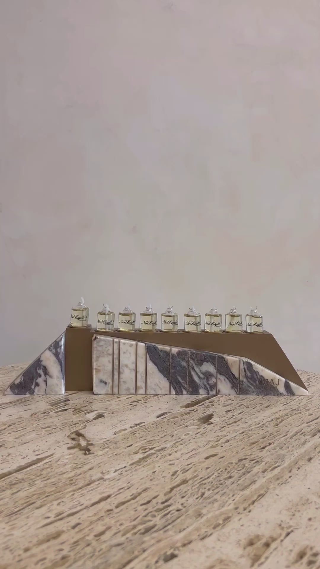 Deux pièces distinctes : l’une en travertin naturel rehaussée de feuille d’or, symbole de lumière et de pureté ; l’autre en bronze et marbre Calacatta Viola, incarnation du luxe et du raffinement.